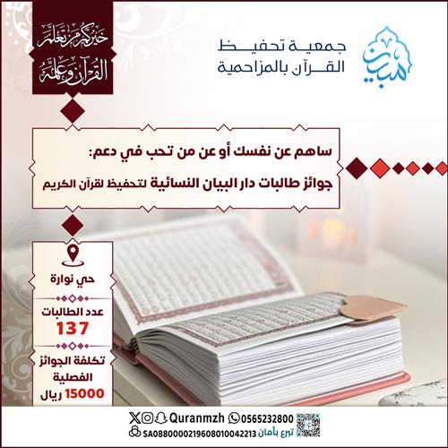 تضم الدار ( 7 ) حلقات للطالبات والأمهات والفتيات وكبيرات السن